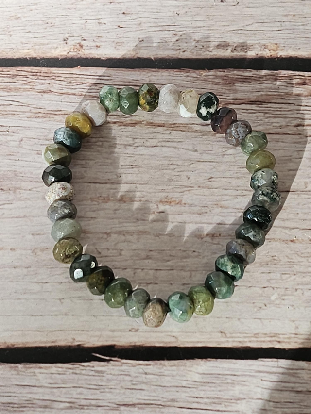 Bracelet en agate indienne naturelle, composé de perles donuts de 8 mm, sélectionnées pour leurs nuances multicolores aux tons verts, bruns et terreux. Ce montage apporte un style original et naturel, tout en restant facile à porter au quotidien.