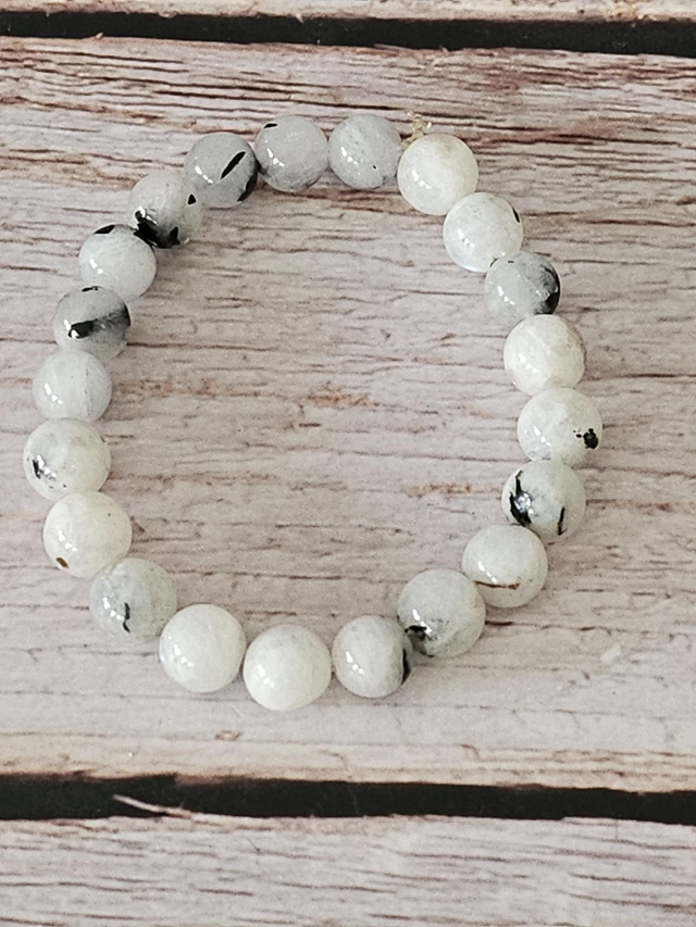 Bracelet en quartz tourmaliné naturel, composé de perles rondes de 8 mm, sélectionnées pour leurs inclusions noires de tourmaline contrastant avec la transparence du quartz. Ce bijou offre un rendu minéral puissant et élégant, facile à porter au quotidien.
