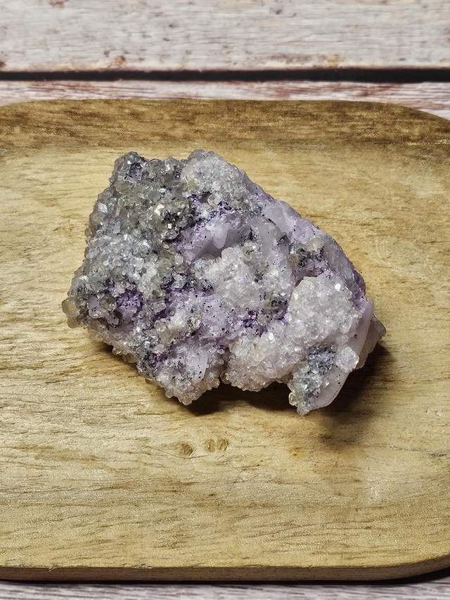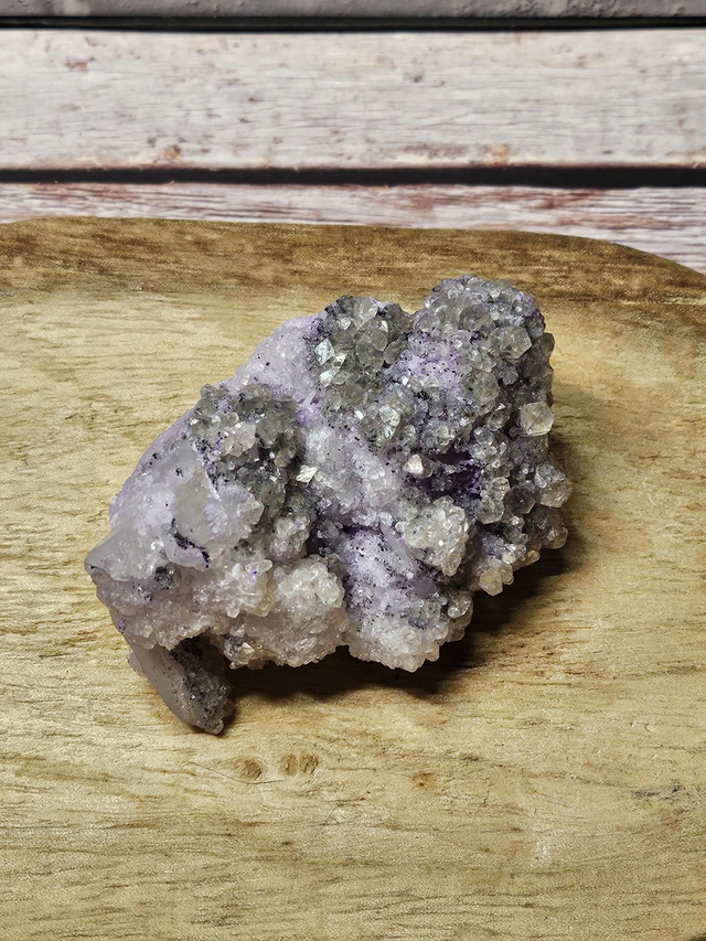 Spécimen minéral associant apophyllite, purpurite et calcite micro rhomboédrique, sélectionné pour l’harmonie de ses cristallisations et son rendu visuel naturel. Cette pièce de 126 g, présentée sur socle acrylique, met en valeur les formes fines et les contrastes de la roche.